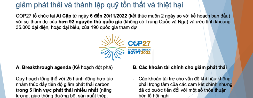 Từ ngày 06 - 20/11/2022 vừa qua, Hội nghị lần thứ 27 Các bên tham gia Công ước khung của Liên hợp quốc về biến đổi khí hậu (COP27) đã được tổ chức tại Ai Cập. Hội nghị có sự tham dự của hơn 92 nguyên thủ quốc gia và ước tính khoảng 35.000 đại diện/đại biểu của 190 quốc gia và vùng lãnh thổ.