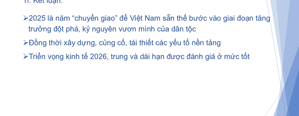 Kết luận: Năm 2025, Việt Nam triển khai mãnh mẽ việc hoàn thiện thể chế --- đây kỳ vọng là bộ khung định hình cho những năm tiếp theo, giúp nền kinh tế, đặc biệt là kinh tế tư nhân, vận hành một cách hiệu quả hơn, linh hoạt hơn, ít phụ thuộc vào Nhà nước hơn và từ đó sẽ phát triển mạnh mẽ hơn. Năm 2026, mục tiêu tăng trưởng cao nhưng dư địa từ chính sách tiền tệ còn ít --- cũng có thể coi là tín hiệu tốt khi chúng ta cần quan tâm hơn đến các biện pháp có tính dài hạn. So với các nước trên thế giới và trong khu vực, Việt Nam được đánh giá cao về triển vọng kinh tế trung và dài hạn.