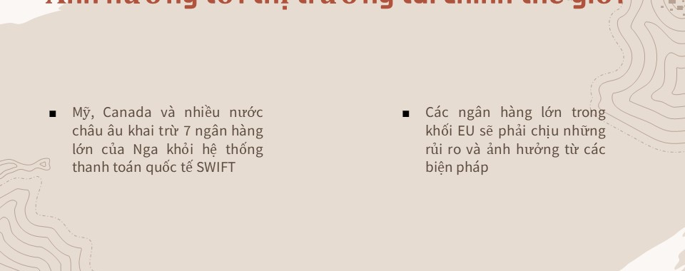 Về thị trường tài chính thế giới, việc Mỹ, Canada và nhiều nước châu Âu khai trừ 7 ngân hàng lớn của Nga khỏi hệ thống thanh toán quốc tế SWIFT cũng như đe dọa việc sẽ phong tỏa kho dự trữ ngoại tệ trị giá 600 tỷ USD của Ngân hàng Trung ương Nga trên toàn thế giới được dự đoán sẽ để lại những ảnh hưởng tiêu cực trong dài hạn đối với nền kinh tế Nga nói riêng.